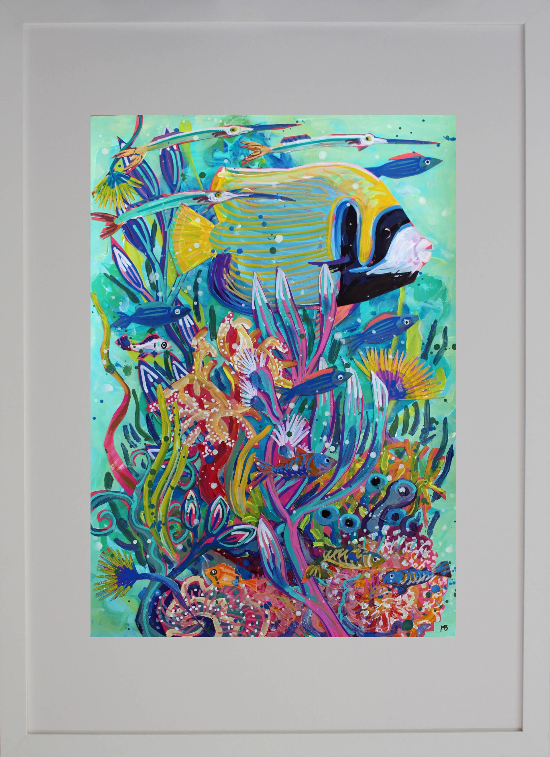 Artwork is framed in a white timber frame.On the back of the frame, hooks and cord are fixed, so ready for hanging on the wall
