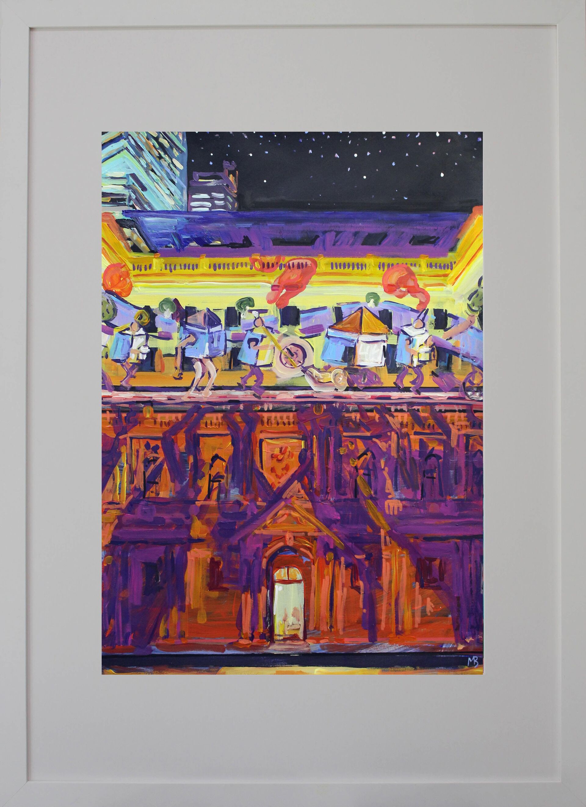 Artwork is framed in a white timber frame.
