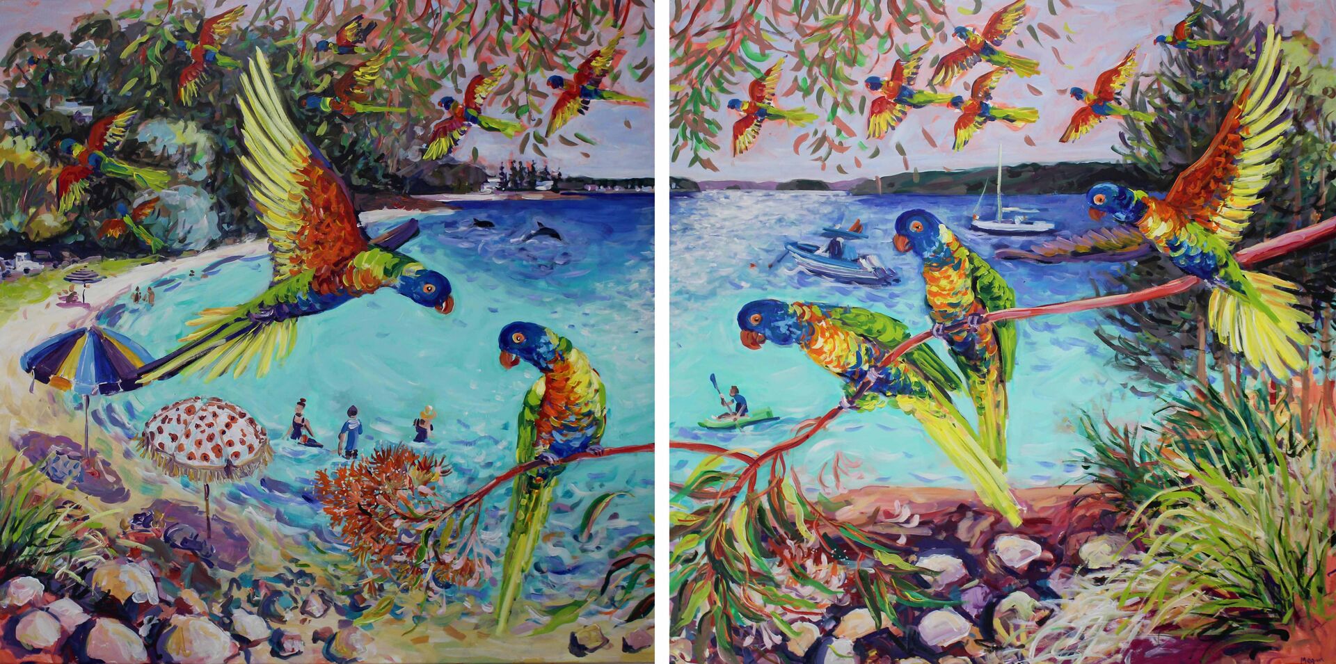 'Dutchies and lorikeets Panel 1' was created as a diptych; to view with 'Dutchies and lorikeets Panel 2'