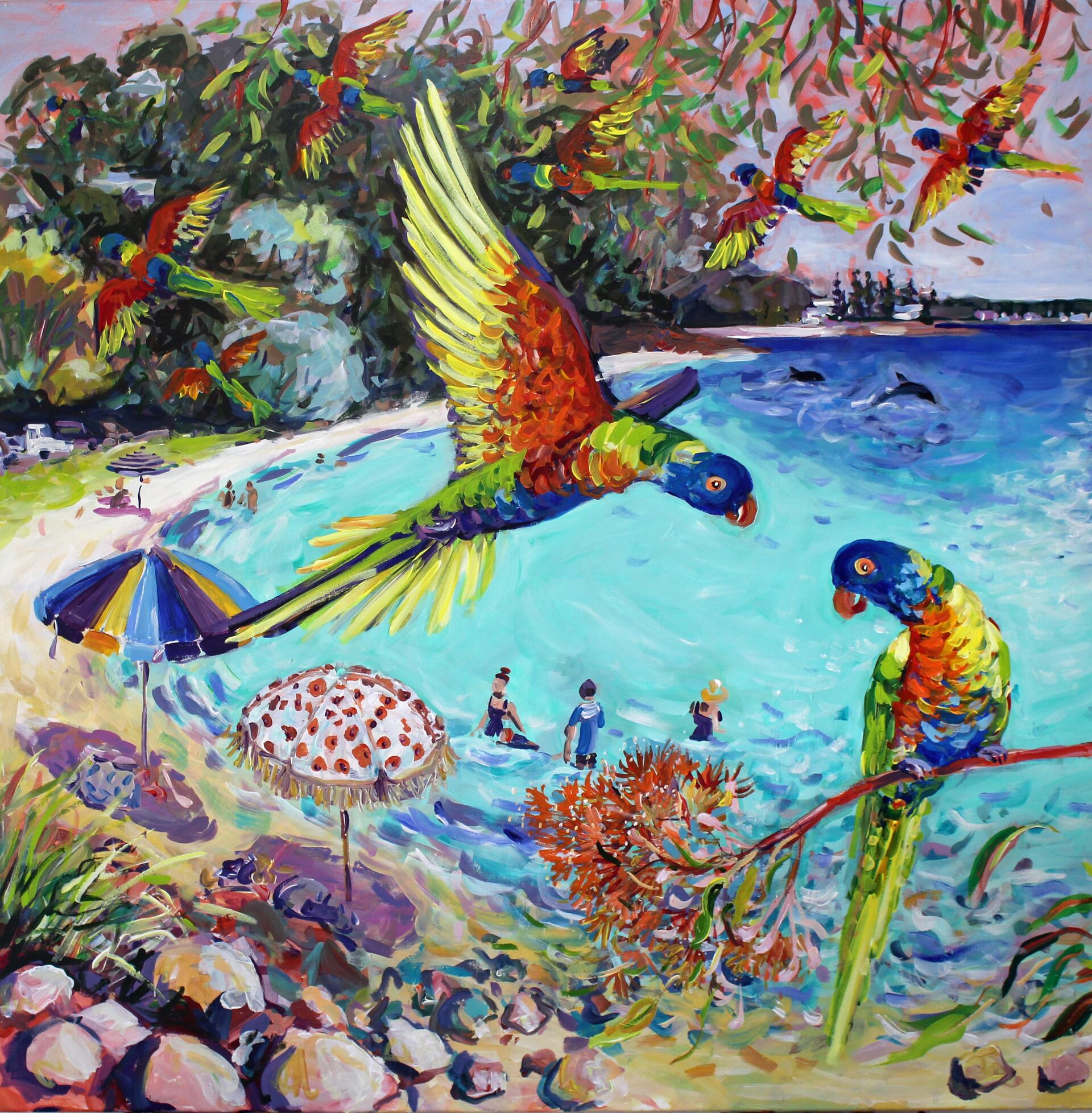 A commission created from the request of capturing beautiful Dutchies beach (Port Stephens NSW) with the sun glistening over the water whilst the flock of local lorikeets shot across the skies.