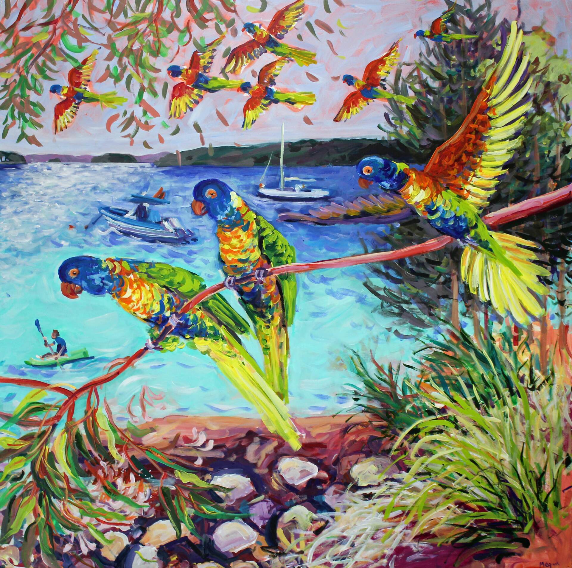 'Dutchies and lorikeets Panel 2' was created as a diptych; to view with 'Dutchies and lorikeets Panel 1'