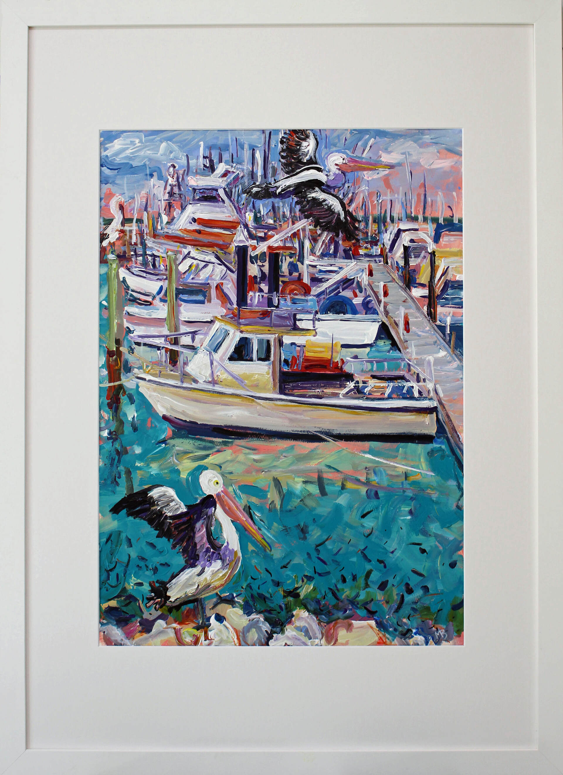 The artwork starts by plein air (working outside placing the main shapes and colours into the composition) and then completed in the studio. This is a local scene I often walk pass. You always find the pelicans by this wharf for obvious reasons.
