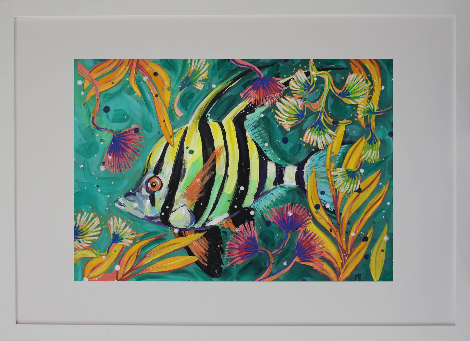Artwork is framed in a white timber frame.On the back of the frame, hooks and cord are fixed, so ready for hanging on the wall