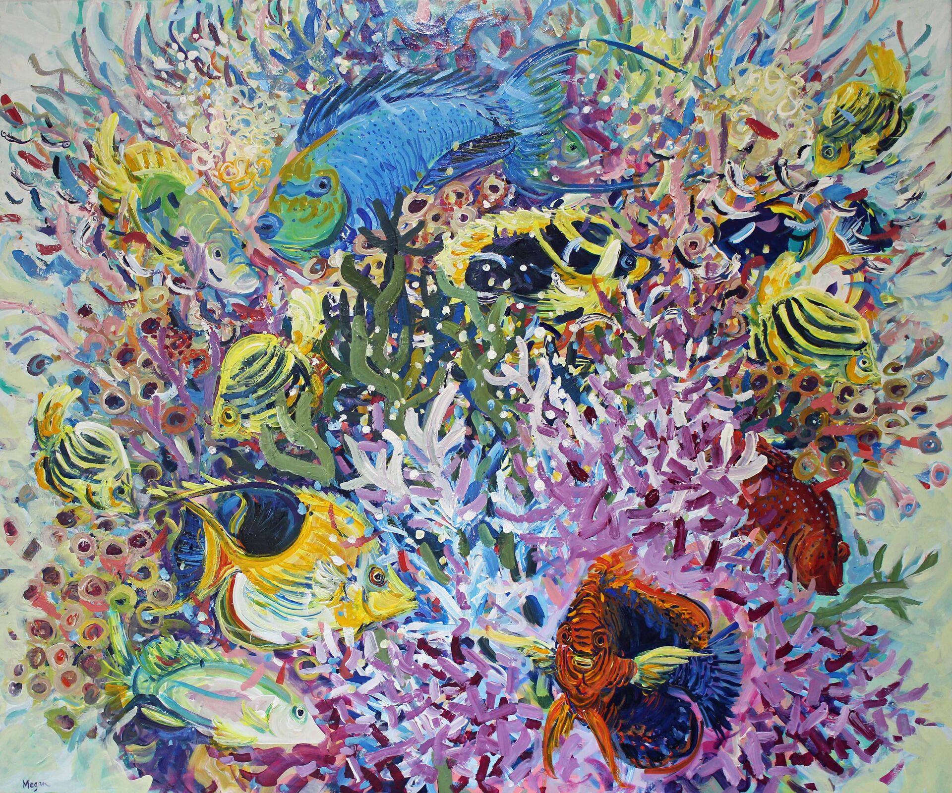 Reef dive is a direct response to diving on the Great Barrier Reef, Australia. On reaching a coral bommie you find so much movement, colour, many many fish varieties darting everywhere. I have created an atmosphere to display this vibrancy of life.